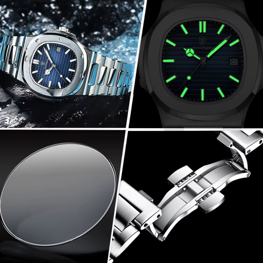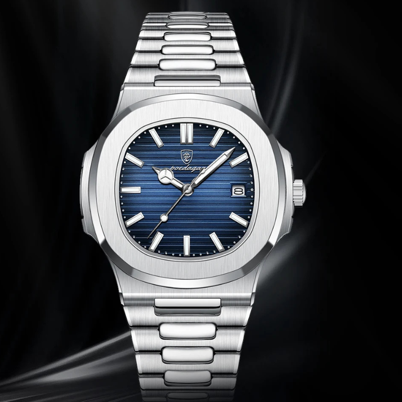 Linhas elegantes, caixa em aço escovado e mostrador azul texturizado que transmitem luxo e presença no pulso.